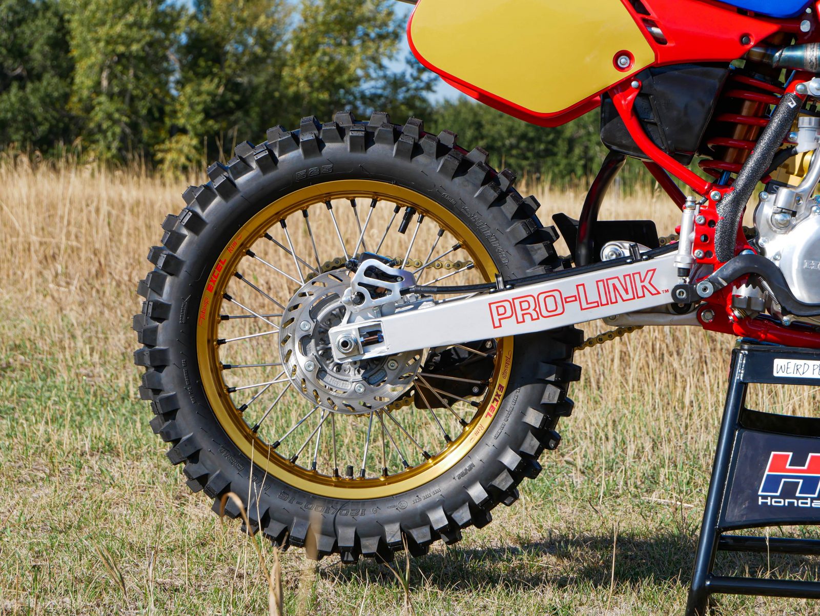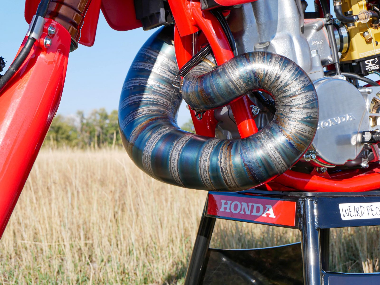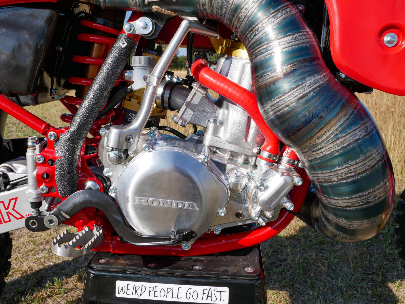 There are some notable changes to this bike, as it is a resto-mod build. It includes a new front end with 47mm Showa forks from a 2006 CRF450R and triple clamps to match. This required custom steering races and bearings offered by All Balls as well as new steering stops welded to the frame. Along with that, a new billet clutch cover from Two Strokes Only saved the day, as the original 1988 cover was damaged beyond repair and difficult to replace with an OEM part.