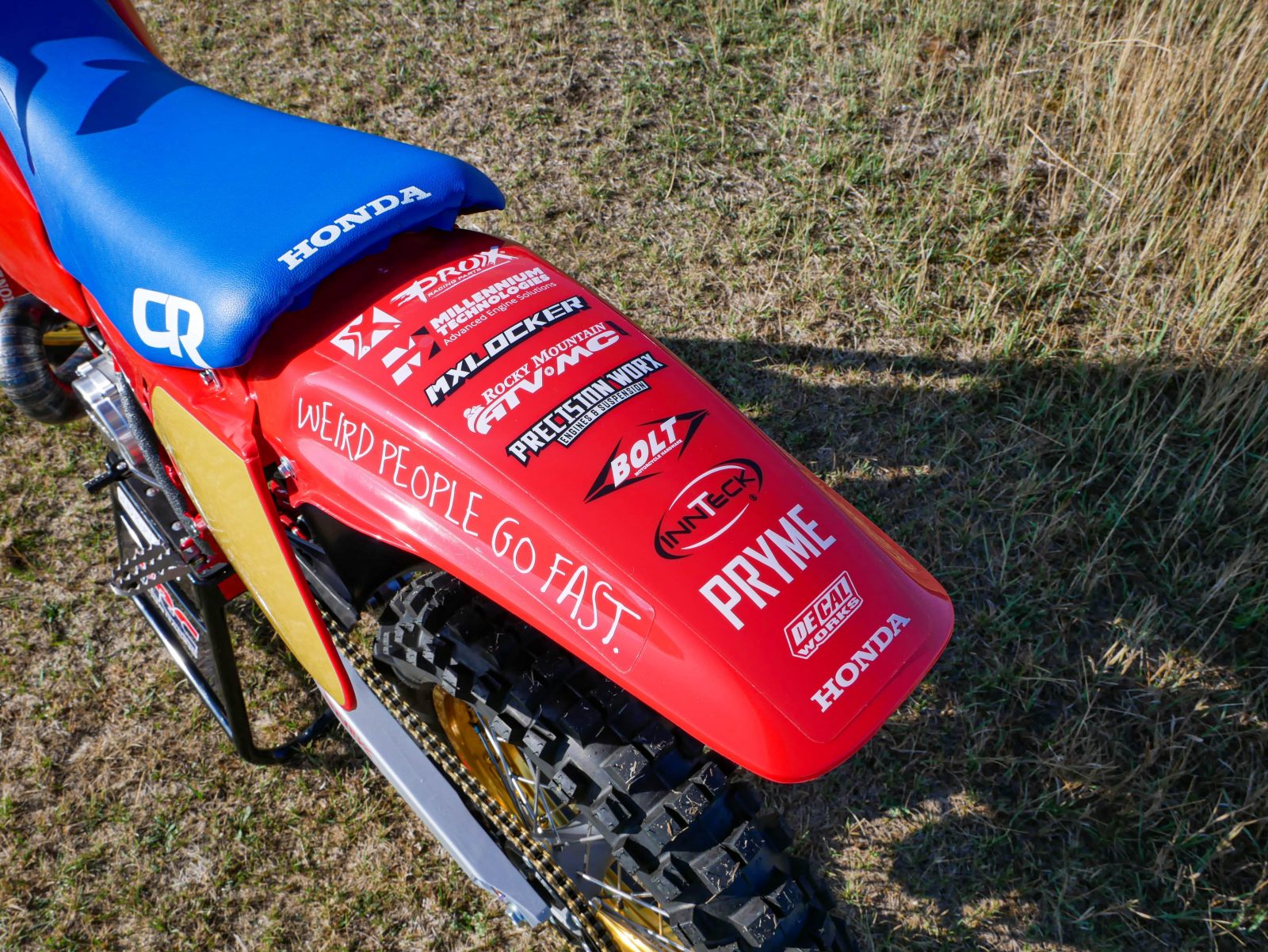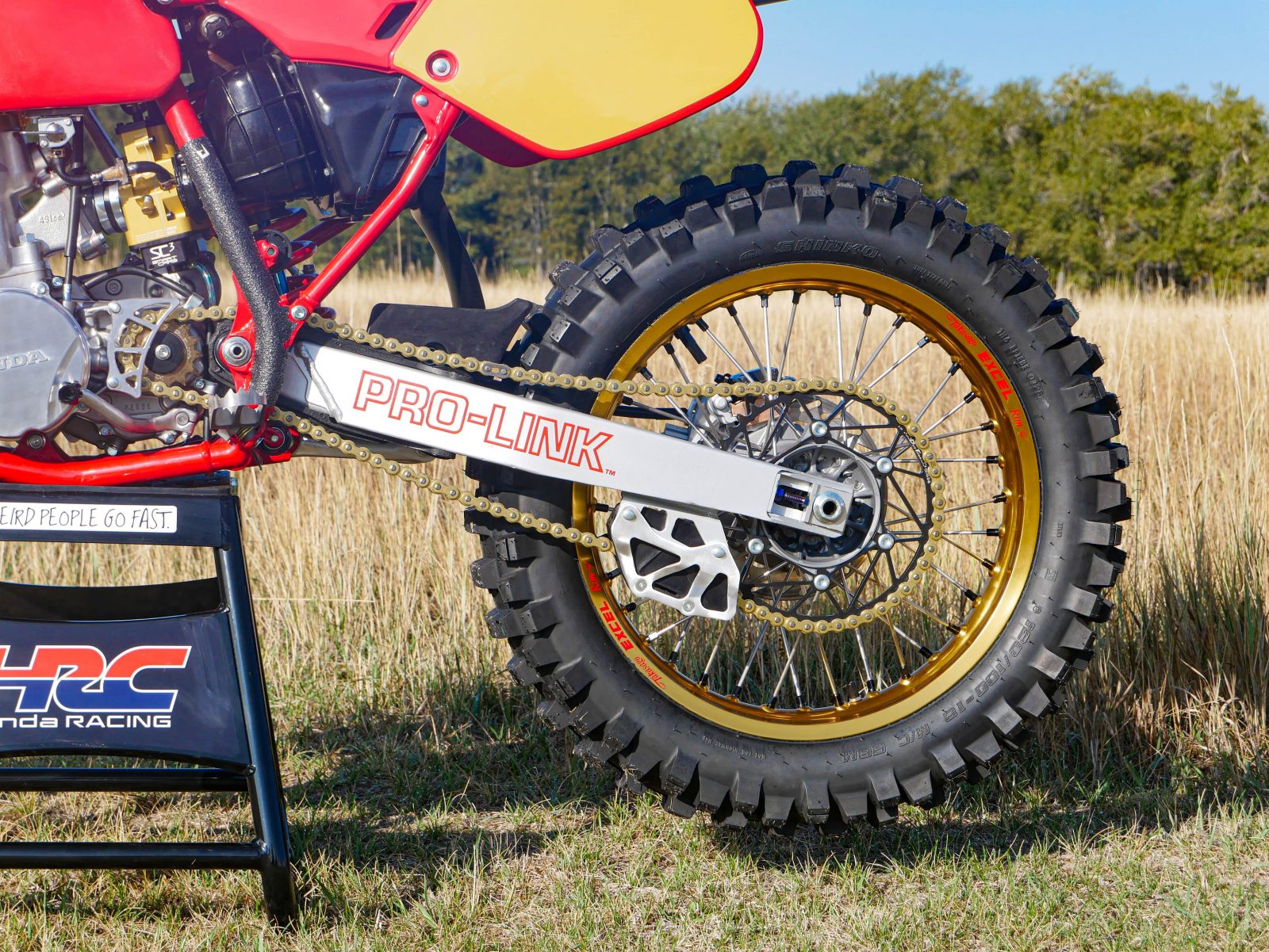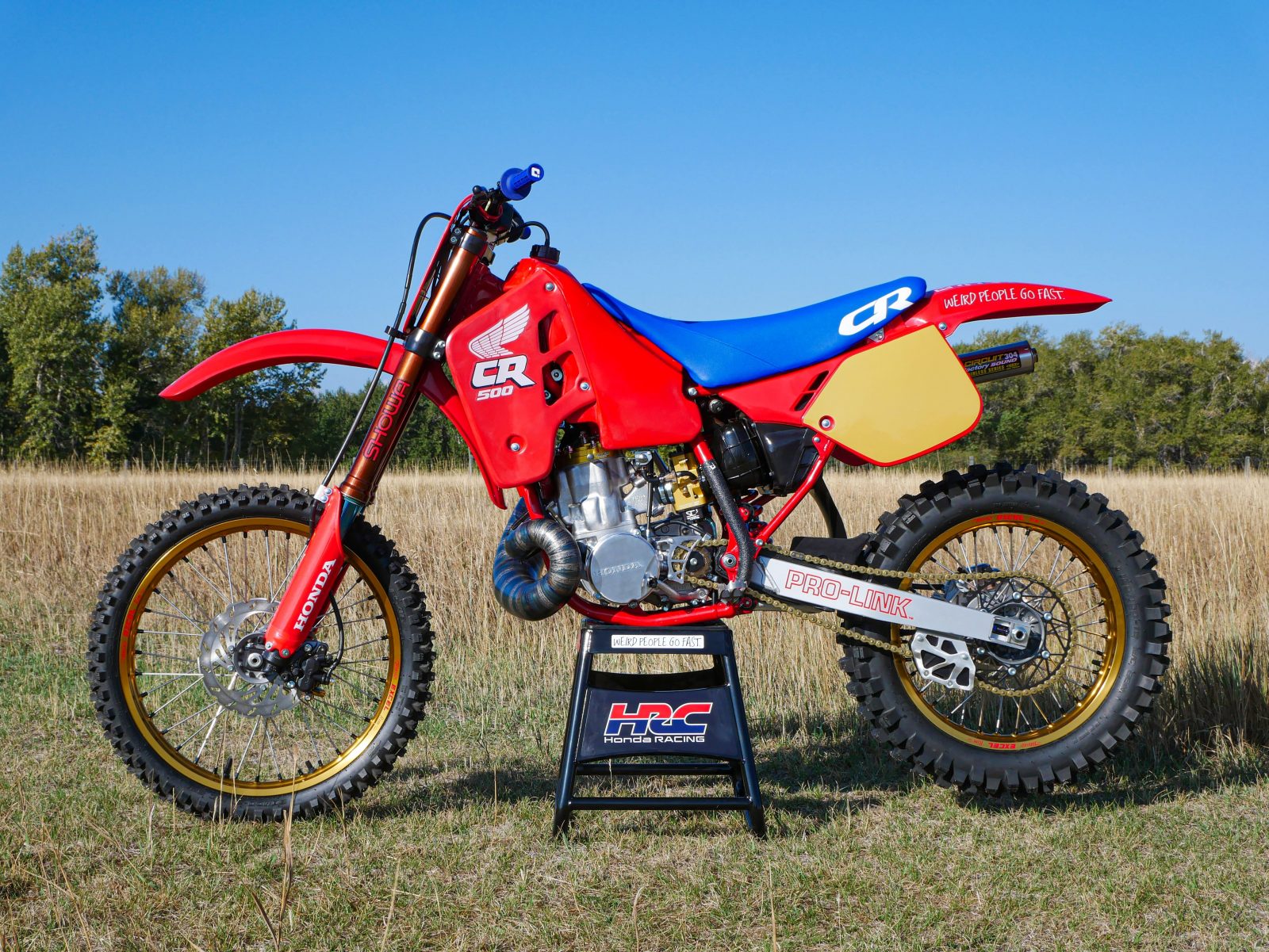 There are some notable changes to this bike, as it is a resto-mod build. It includes a new front end with 47mm Showa forks from a 2006 CRF450R and triple clamps to match. This required custom steering races and bearings offered by All Balls as well as new steering stops welded to the frame. Along with that, a new billet clutch cover from Two Strokes Only saved the day, as the original 1988 cover was damaged beyond repair and difficult to replace with an OEM part.